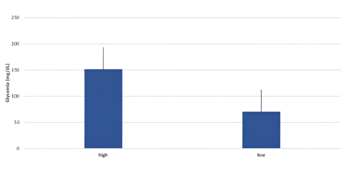Figure 1: Mean glycemia of the High (frozen after collection) and the Low (left at room temperature for 24h) plasmas. Error bars represent the standard error.