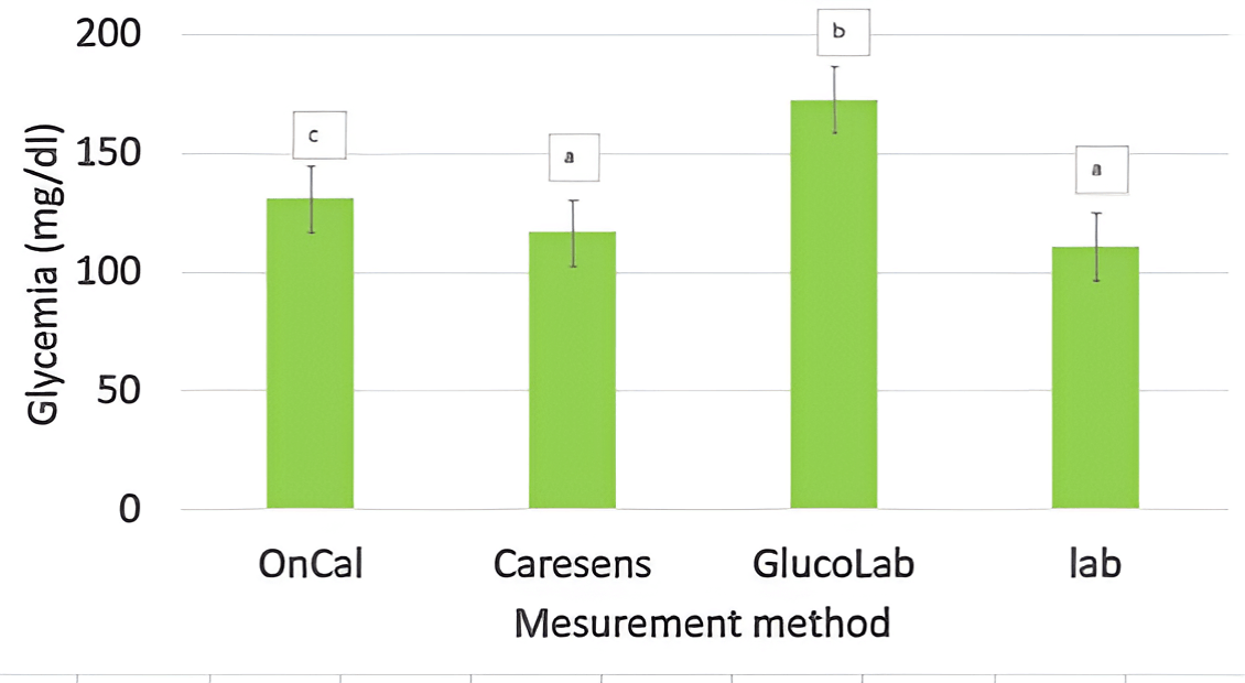 Figure 3: Glycemia measured by different glucometers or in the lab. Bars lacking a common letter differ (p<0.05). Error bars represent the standard error.